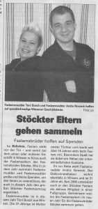 Allgemein Die Faslamseltern sammeln wieder! 7. Dezember 2017 / 19. Dezember 2024 von 1. Vorsitzender | Kommentar schreiben Faslamsvadder (Philipp Fascher) und Faslamsmudder (Manuel Papzien) Unsere Faslamseltern sind wieder unterwegs. Da sich unser Umzug diese Saison früher ankündigt machen es unsere Eltern diese Saison genauso. Ab dem 09.12.2017 sind sie in Stöckte, Winsen und Umgebung unterwegs und sammeln für den Verein. Zu erkennen sind sie an ihren übergroßen rot-weißen Krawatten. unser Dank gilt […] Weiterlesen » Faslamseltern Faslamsmudder Faslamsvadder Stöckter Faslam Stöckter Faslam 2018